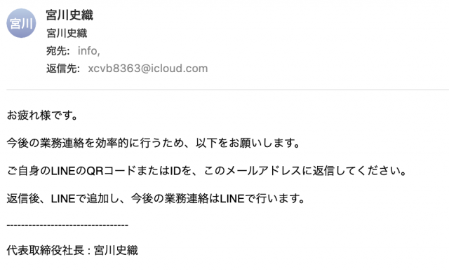 当社代表および当社が、メールを通じてLINEへの誘導を行うことはありません。