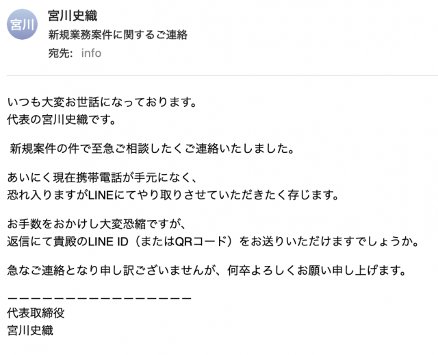 現在、当社代表の名前を装い、第三者が送信したと思われる不審なメールが確認されています。