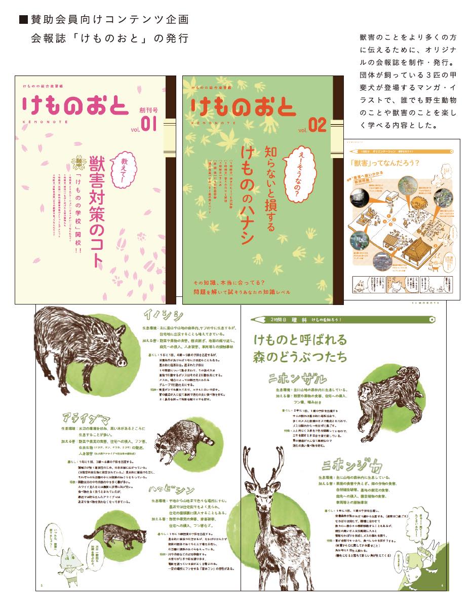 賛助会員向けの会報誌の制作。ノートをモチーフに、子供が読んでも大人が読んでもわかりやすい内容にしている。クイズ形式やイラストで獣害のことをや野生動物のことを楽しく学べる。