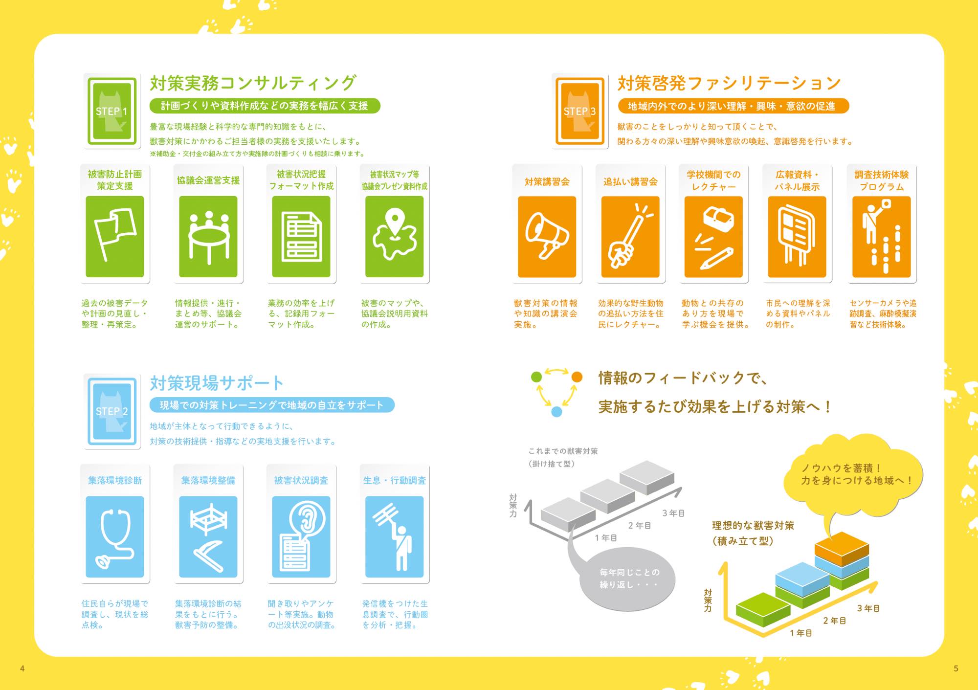 生態系への知識やICT技術を駆使しながら的確な対策を行ったり、地域に住む人々とのワークショップで住む人も獣害を予防するための取り組みなどを行ったりしている。